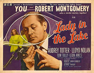 LADY IN THE LAKE (1947): A lady editor (Audrey Totter) hires Phillip Marlowe to investigate the disappearance of her boss’ wife. First time director Robert Montgomery, who also starred as Marlowe, chose to shoot the entire film from Marlowe’s POV using a subjective camera to replicate visually Raymond Chandler’s first-person narrative from the novel. Dir. Robert Montgomery