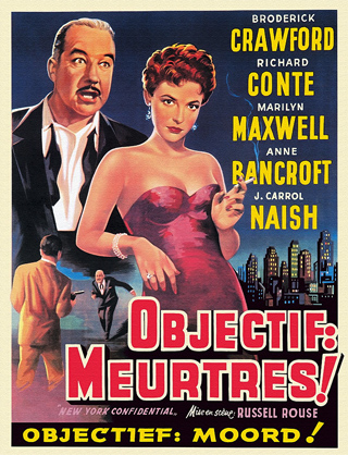 NEW YORK CONFIDENTIAL (1955): Crime syndicate boss Nick Lupo (Broderick Crawford) wheels and deals while mentoring an ominous torpedo (Richard Conte), coping with a gold-digging mistress (Marilyn Maxwell), and managing a rebellious daughter (Anne Bancroft). Written, produced, and directed by the team of Clarence Greene and Russell Rouse (D.O.A, Impact, The Well, Wicked Woman) this dramatic “syndicate noir” was inspired by both the 1950s Kefauver organized crime hearings and the notorious Apalachin conference of underworld kingpins. With J. Carrol Naish, Onslow Stevens, Barry Kelley and Mike Mazurki. Dir. Russell Rouse