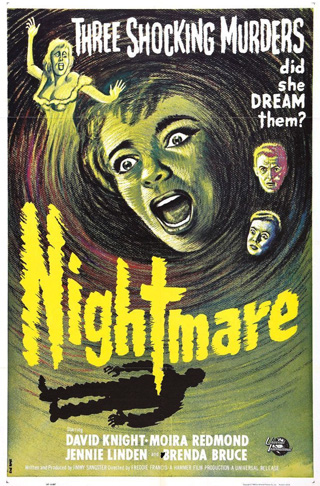 NIGHTMARE a.k.a. Here’s the Knife, Dear: Now Use It (1964): A young woman (Jennie Linden) is plagued by nightmares of her asylum-patient mother. Upon returning to her family home, the nightmares seem to become real when she sees a strange woman pacing the halls. written by Jimmy Sangster, who also produced the film for Hammer Films. Dir. Freddie Francis