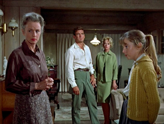 THE BIRDS (1963): Beautiful heiress Melanie (Tippi Hedren) takes a sudden fancy to a handsome architect Mitch (Rod Taylor) who lives in a remote Californian coastal village with his overly affectionate mother (Jessica Tandy) and little sister. Creepily Melanie follows him there and pretends to be an old friend of his ex-girlfriend (Suzanne Pleshette). Even more creepily, after her arrival, the village is besieged by flocks of killer birds. Look for noir toughie Charles McGraw in a supporting role. Legendary animator turned special effects expert Ub Iwerks won the Oscar for Best Effects, Special Visual Effects for his work on the film. Dir. Alfred Hitchcock