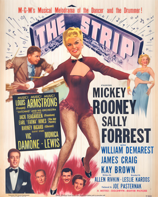 THE STRIP (1951): Veteran and drummer Stanley Maxton (Mickey Rooney) moves to Los Angeles with dreams of opening his own club but becomes entangled with a racketeer (James Craig) and a nightclub dancer with ambitions for Hollywood (Sally Forrest) and ends up accused of murder. The film features Louis Armstrong and his Orchestra as well as Monica Lewis and Vic Damone as themselves. Much of the picture was shot on location in and around the Sunset Strip. Interiors were shot at popular nightclubs Mocambo and Ciro's and at restaurants Little Hungary and Stripps. Dir. László Kardos