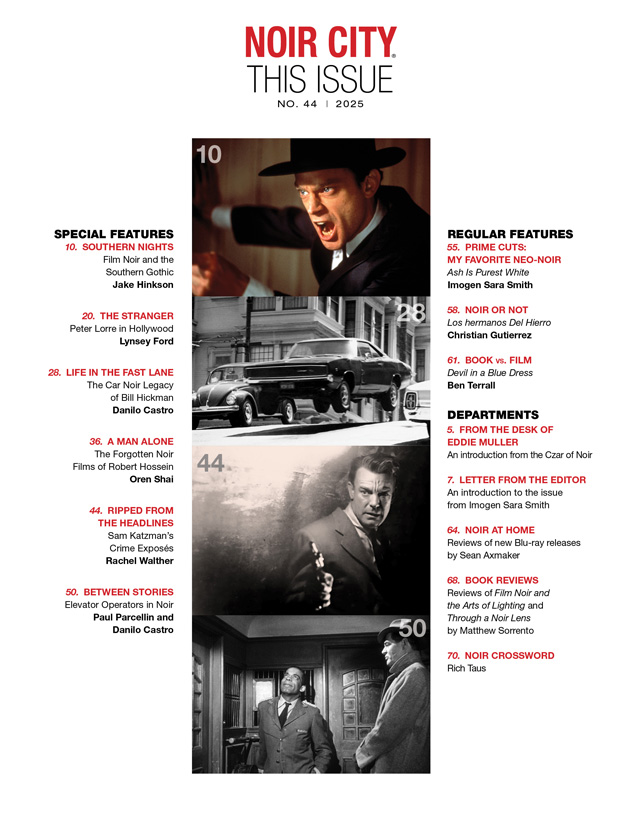 I'm thrilled to bring you another stellar issue of NOIR CITY, the magazine of the Film Noir Foundation. Editors Imogen Sara Smith and Danilo Castro have cooked up quite a feast for this issue, with wide-ranging articles that span many decades and disparate locales. While keeping ourselves firmly planted in the mid-twentieth-century noir tradition, we are always enthused to explore new avenues and alleyways where the ethos and artistry of noir has unexpectedly appeared.