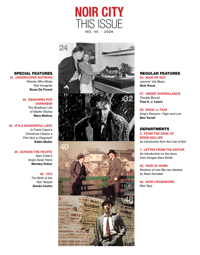 In this issue of NOIR CITY, we shine a light on artists who stayed in the shadows, by choice or necessity. In the revelatory “Undercover Authors,” Sloan De Forest investigates the real stories of women crime writers who published under male names. Mary Mallory unearths the work of designer Martin Obzina (Black Angel and The Killers). Danilo Castro reviews a trio of neglected films from 1975 building an argument about why movie sequels work or—more often—don’t. And though it’s a bit past Christmas, you’ll want to read Eddie Muller’s essay on It’s a Wonderful Life!